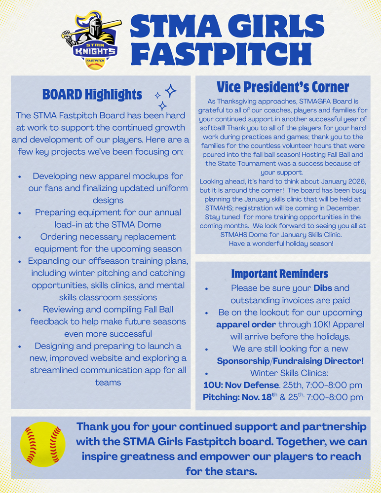 The mission of the St. Michael-Albertville Girls Fastpitch Association is to provide a program for St. Michael-Albertville area girls to learn softball skills, build self-confidence, and enjoy the benefits of being on a team while having fun!